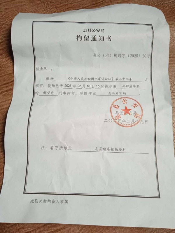 2月18日早上7点多,河南息县维权人士邢望力被当地居委会、淮河街道办事处人员诱骗至淮河街道派出所,息县公安局治安大队警察陈万一带着多名穿着防暴服的警员,将邢望力打上背铐,当天下午送到息县看守所,以涉嫌寻衅滋事刑事拘留。