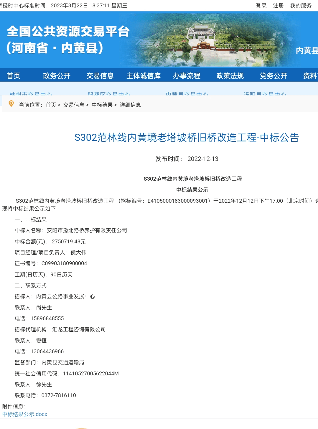 例如,2022年12月13日,全国公共资源交易平台(河南·内黄县)发布内黄县S302范林线内黄境老塔坡桥旧桥改造工程-中标公告,显示招标人为内黄县公路事业发展中心,中标人是安阳市豫北路桥养护有限责任公司,中标金额为 2750719.48元 。