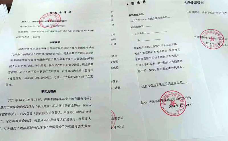 近日,济南幸福年华珠宝有限公司的副总刘洪宇诉说了他们单位去年10月28日以来多次报警,直到2024年3月19日才接到受案回执的事情。公司和他都期待着滕州警方能够尽快立案侦查,严惩犯罪、积极挽损。