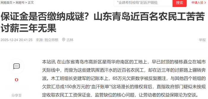 为讨回血汗钱,农民工们曾多次向青岛市、山东省政府及国家信访局反映情况,但均未获得实质性进展。“这么明确的欠薪问题,怎么就没人管、解决不了?”他们的质问,道出了对权益保障体系的失望。