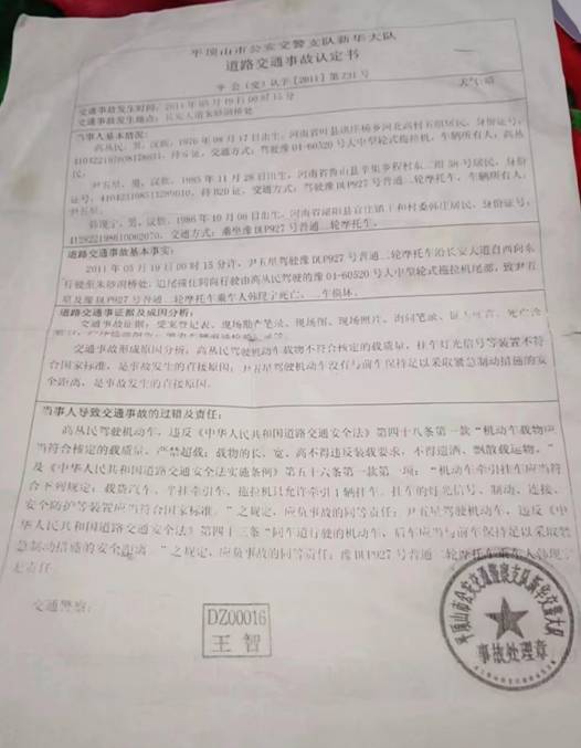 三、当时出了两个人命,当场平顶山交警支队办案人员为什么不把人拘留起来?他徇私舞弊,收受贿赂,让高丛民逍遥法外,追究交警队办案人员的责任问题。我儿子和同学尹五星正常行驶,保持了有效的安全距离,他的四轮严重超载,当时正在上坡的时候导致下滑,才造成事故。交警队出警人员说,他们到现场高丛民的车就挪到了一边,这属于高丛民私自移动现场,划分同等责任。要是通知我们两家看到现场,就是判我们全责我们也没啥说。尹五星没有被拉到医院抢救,就直接拉到火葬场(现在一个骨灰盒还在火葬场),还出具了诊断证明,我们问交警队要,他们说没有诊断证明,那是怎么知道尹五星已经死了,为什么事故认定书写的有诊断证明,证件齐全,为什么不通知家属,这明明白白是在造假。