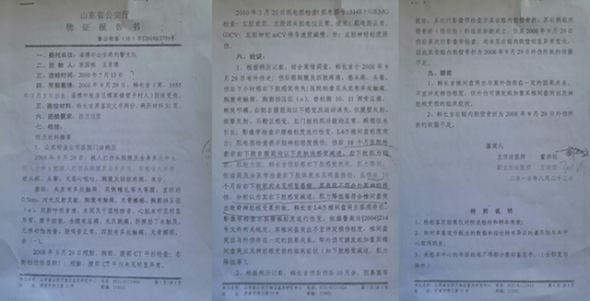 为了维护自己的合法权益,他先后到省纪委、省市区各级信访部门进行上访,写实名举报信。迫于信访的压力,淄博市法医伤害鉴定中心为他出具了法医学人体损伤程度重新检验意见书(淄法鉴【2010】字第23236号)。但是,韩长吉认为,淄博市公安局刑警支队法医队副大队长刘长清,伙同其他四名法医,故意将他右腿被打成神经源性瘫痪的原因,定性为腰椎间盘突出造成的,并且只字不提右眶内壁骨折这个伤情,刻意不采信中医院、骨科医院法医的检查结果,以及中心医院的漏诊诊断书及漏诊证明,因为这些都记载了他右侧眶内壁骨折这个事实。