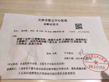 11月8日早上6点50分左右,在项目经理指派的扫雪工作中(有工作群记录),我父亲不慎摔倒(指派工作区域是门口及附近)。摔倒后,由事发地点的中建八局上班员工看到并发视频通知我,由120送至塘沽医院入院治疗。经历两次开颅手术,至今昏迷不醒,面临高昂的治疗费用。