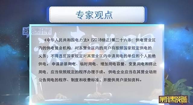 在专题节目中,北京林业大学教授杨朝霞发表观点:我们说二十几年来,他80%的电是他自己发电的,就是东莞市供电公司不给。这个来说是违法的。因为我们的《电力法》是明确规定的,就是电力公司、电力的供电机构是有给用户供电的强制的义务的。你不能拒绝供电,如果是拒绝供电,那么就是违法,就是你的强制义务。
