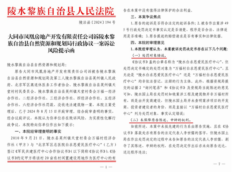 案件于2024年8月15日正式开庭审理。2024年9月23日,陵水县法院正式向该县自然资源和规划局(被告)发送了陵法函〔2024〕194号《大同市凤凰房地产开发有限责任公司诉陵水黎族自治县自然资源和规划行政协议一案诉讼风险提示函》。