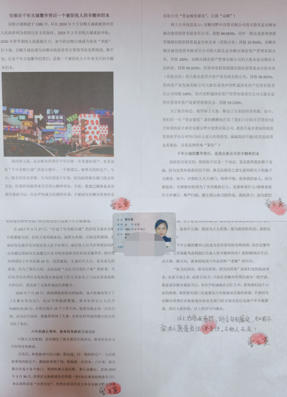 安顺古城始建于1381年,早在2020年7月安顺古城就被贵州省人民政府列为省级历史文化街区;2024年2月安顺古城重新开街,2026年春节期间人流量破百万,如今的安顺古城已经成为客流“顶级”打卡地。安顺古城也是安顺市政府某些主要领导的光辉政绩。殊不知,在这千年古城繁华的背后,是我一个被征收人六年来无尽的辛酸和泪水。