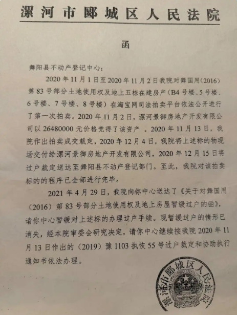函件称,“2021年4月29日,本院曾向你中心送达了《关于对舞国用(2016)第83号部分土地使用权及地上房屋物暂缓过户的函》,请你中心暂缓对上述标的物办理过户手续。现暂缓过户的情形已消失,经本院审委会研究决定,请你中心继续按我院2020年11月13日作出的(2019)豫1103执恢55号过户裁定和协助执行通知书依法办理。”