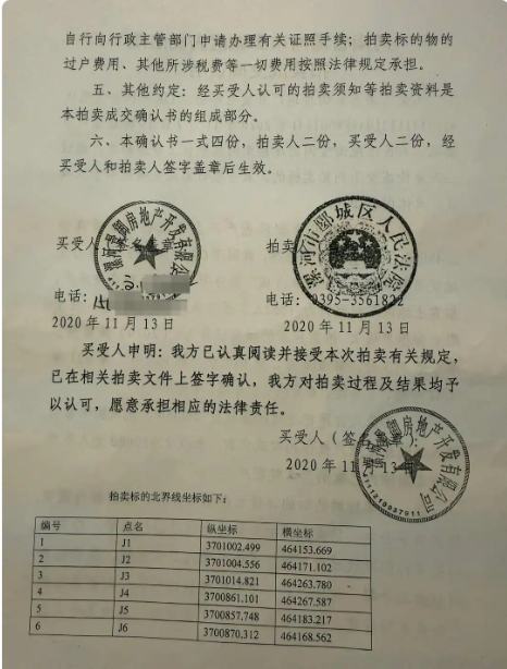▲2020年11月,法拍完成后,漯河市郾城区法院出具的成交确认书