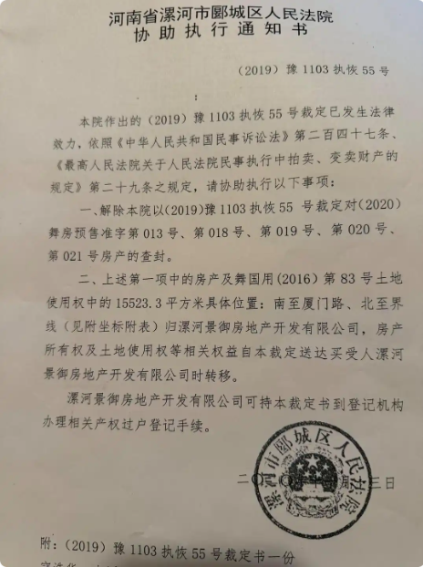 景御公司的一位投资人告诉红星新闻记者,2020年11月13日,郾城区法院向景御公司送达了上述拍卖成交确认书和(2019)豫1103执恢55号执行裁定书、协助执行通知书,确认上述标的物拍卖程序,并通知景御公司携带上述文书去相关部门办理过户登记。