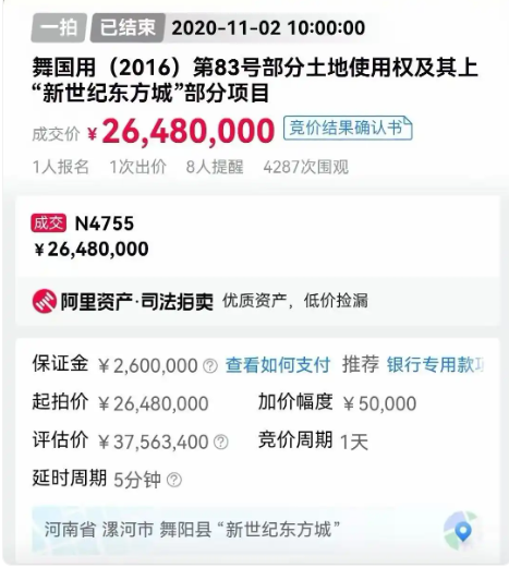 成交确认书显示,当日上午10点,通过淘宝网司法拍卖平台,河南漯河景御房地产开发有限公司(以下简称“景御公司”)以最高价2648万元竞得标的物,拍卖人为郾城区人民法院。标的物为漯河市舞阳县新生房地产开发有限公司(以下简称“新生公司”)名下的舞国用(2016)第83号部分土地使用权及其上“世纪东方城”部分项目地上五栋在建房产,拍卖土地使用权面积为15523.3平方米;拍卖房屋的预售证号为:(2020)舞房预售准字第013号,第018号,第019号,第020号,第021号(B4号楼,5号楼,6号楼,7号楼,8号楼)。