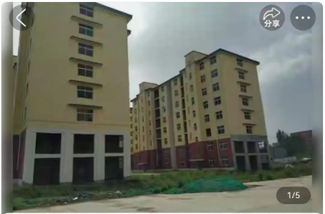2026年1月9日,漯河市舞阳县厦门路一侧,上述被查封五年多的五栋8层房屋被临时修建的围墙隔开,部分外墙涂层已经脱落,楼前杂树斜生。